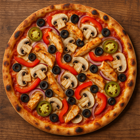 (grilled chicken fillet, bell pepper, mushrooms, onion, olives and Jalapeño)